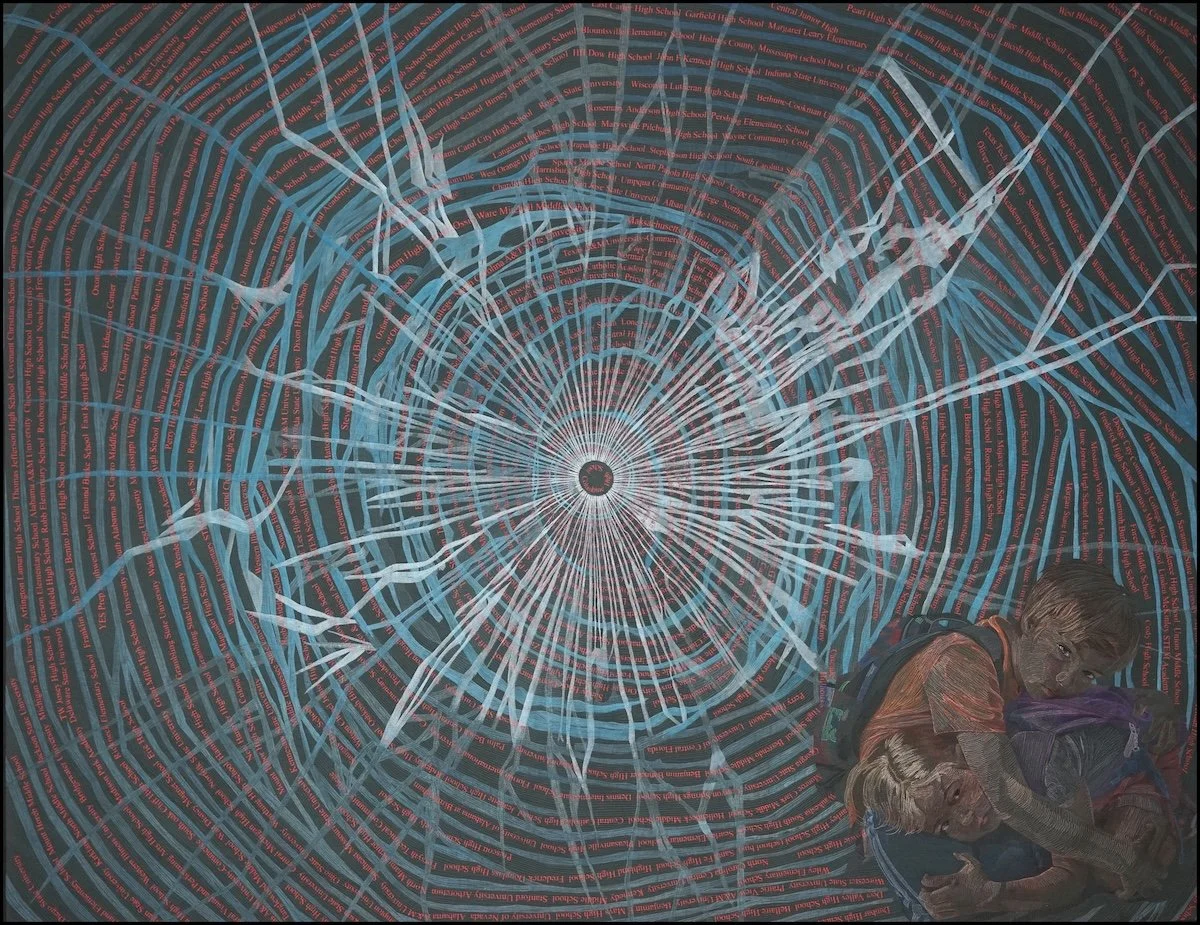 Artist Statement: I created Ripple Effect as a recognition of the reality of what is happening in our country. I have placed the names of the 493 schools where shootings took place from 1998 to March 2004 (when I finished designing the quilt) in the background. There have been many more shootings since then. These shootings have an enormous Ripple Effect in our schools and communities. The active shooting drills are causing trauma among the students and teachers. How much longer must we allow this to continue? When will our children be more precious than our guns?